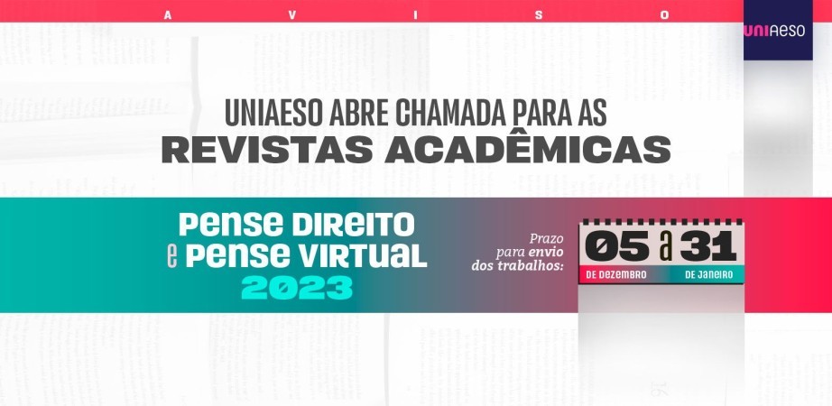 A UNIAESO abriu chamada para submissão de trabalhos para as revistas Pense Direito (curso de Direito) e Pense Virtual (outros cursos). Artigos científicos, resenhas, relatos de experiência, ensaios visuais, resultados de pesquisas e de atividades desenvolvidas são esperados.