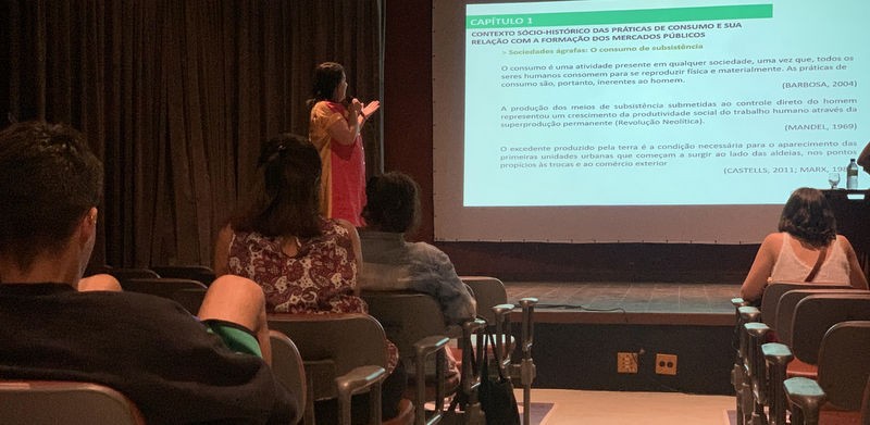 A bancada de apresentações da terça-feira pela manhã foi formada por uma equipe feminina. Mediado pela coordenadora do curso de Publicidade e Propaganda da Barros Melo, Mayra Wacquim, o GT4 - Consumo e Sustentabilidade teve Renata Pittol, Luana Ianuzzi, Samara Cristina e Sofia Torres, todas do curso de Design, que mostraram os trabalhos desenvolvidos no primeiro semestre, deste ano, para o Interdesign. Além das alunas, Bruna Malta contou sobre a sua pesquisa de mestrado “Os mercados públicos de recife sob a ótica do consumo coletivo: significados e tendências”. Após as apresentações, foi aberto um espaço ao público para as perguntas.